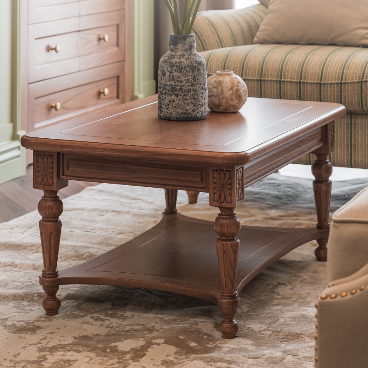 Bàn trà Classic Aura là sự hòa quyện tinh tế giữa vẻ đẹp cổ điển châu Âu và sự tinh chỉnh tỉ mỉ để phù hợp với nhu cầu sử dụng của người Việt. Lấy cảm hứng từ những không gian sống sang trọng, ấm cúng, bàn trà mang nét mềm mại trong đường nét nhưng vẫn giữ được sự vững chãi. Từng chi tiết hoa văn chạm khắc thủ công trên chân bàn gợi nhớ đến nghệ thuật trang trí truyền thống, nhưng được đơn giản hóa để phù hợp với phong cách nội thất đương đại.