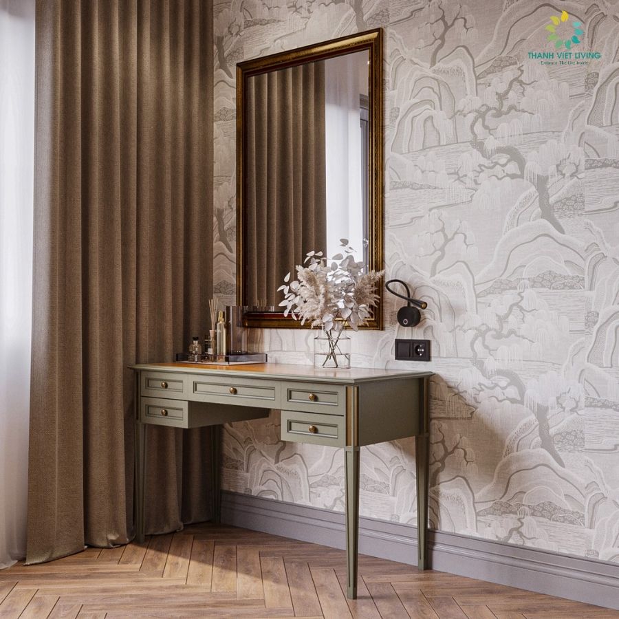 Bàn trang điểm Facenlie sử dụng gỗ Tần bì tự nhiên sơn màu tự chọn theo bảng màu, chân bọc hợp kim mạ màu vàng