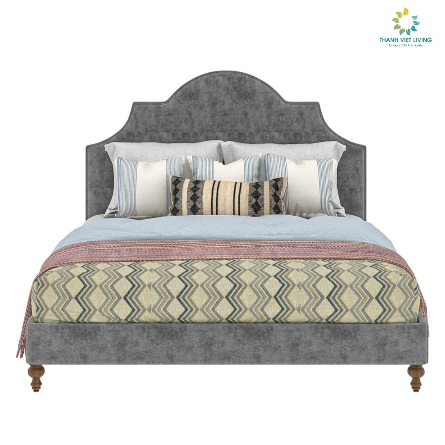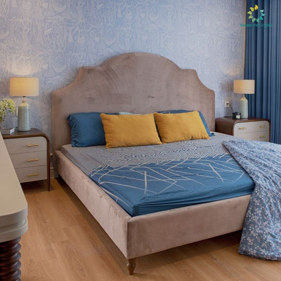 Giường Glivante sử dụng gỗ Tần bì nhập khẩu xẻ sấy hoàn thiện, chân con tiện sơn Inchem nhập khẩu Mỹ lau màu theo phối cảnh bọc nỉ nhung quyển màu tự chọn theo bảng mẫu.