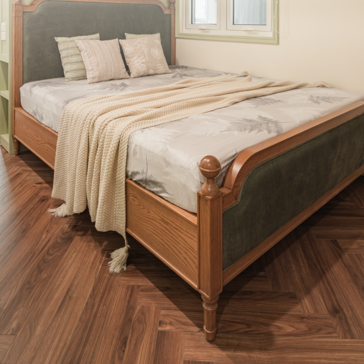 Màu xanh olive không chỉ gợi liên tưởng đến sự an yên của thiên nhiên, mà còn là gam màu “dễ sống” – dễ kết hợp với các phong cách nội thất khác nhau, từ cổ điển tinh xảo đến hiện đại tối giản. Trong khi đó, sắc nâu vàng của gỗ sồi Mỹ làm nổi bật vân gỗ tự nhiên, đem đến sự gần gũi và ấm cúng.
