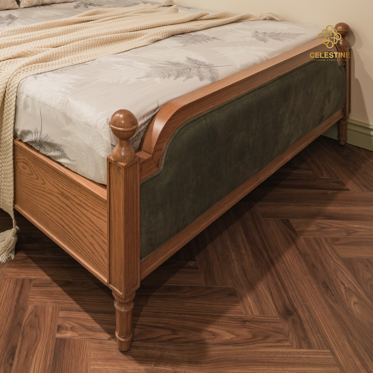 Vẻ đẹp bền vững của Sabina đến từ sự kết hợp giữa gỗ sồi Mỹ nhập khẩu loại 1 và vải bọc nhập khẩu từ Bỉ. Gỗ sồi Mỹ nổi tiếng về độ bền, khả năng chống cong vênh, chịu lực tốt và mang vân gỗ đẹp tự nhiên. Lớp hoàn thiện được xử lý theo tiêu chuẩn cao cấp giúp bảo vệ bề mặt khỏi ẩm mốc, trầy xước, đồng thời giữ trọn vẻ mộc mạc vốn có của gỗ.